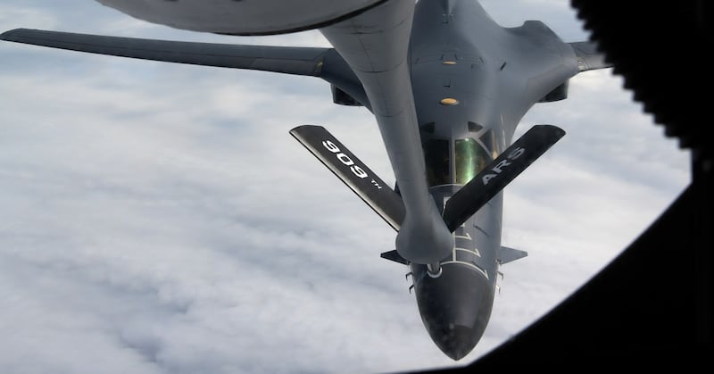 A U.S. Air Force KC-135 Stratotanker from the 909th Air Refueling Squadron at Kadena Air Base, Japan, prepares to refuel a B-1B Lancer over the South China Sea July 17. (Airman 1st Class Rebeckah Medeiros/Air Force)